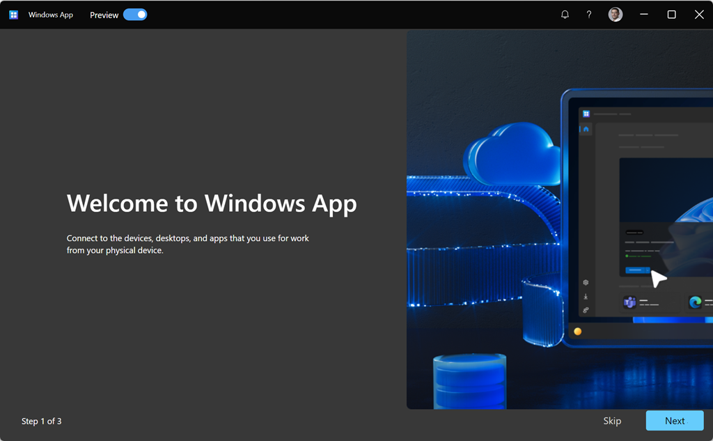 A new client application (UWP) – Windows App – is available from the Microsoft Store allowing end-users to have a single access pane to connect to Azure Virtual Desktop, Windows 365 Cloud PC’s, Dev Box or remote desktop services.