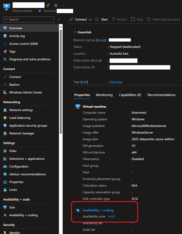 - Looking at the Overview blade, locate the Availability+scaling\Availability zone section to click the Edit button