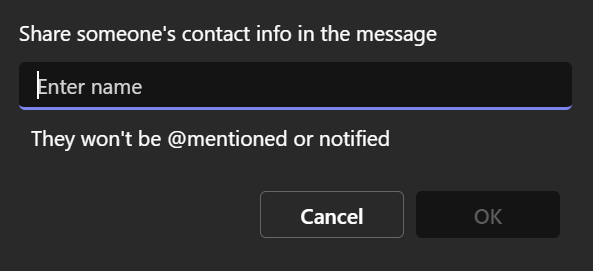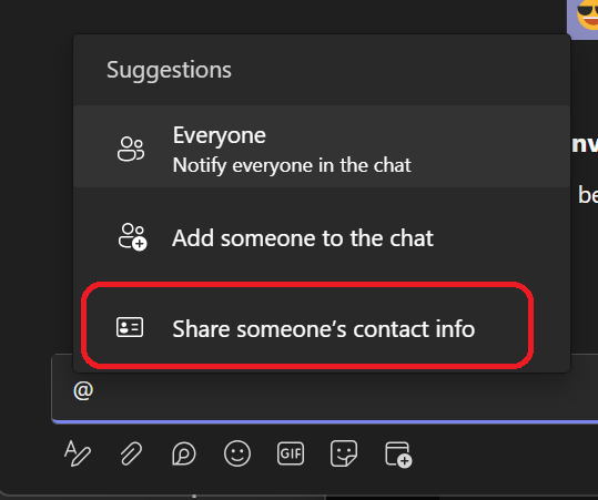 Well, you now have an additional option available when using the @ symbol in chat: share contact’s details of somebody from your organization.