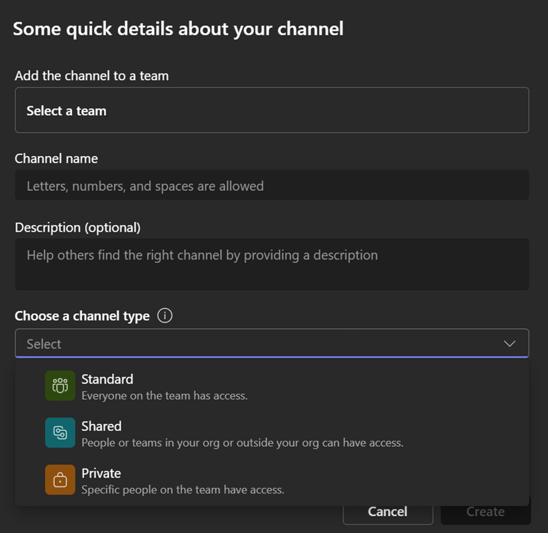 When creating the channel from the top level, you have then to select the Teams where the channel will be created as well the channel type.