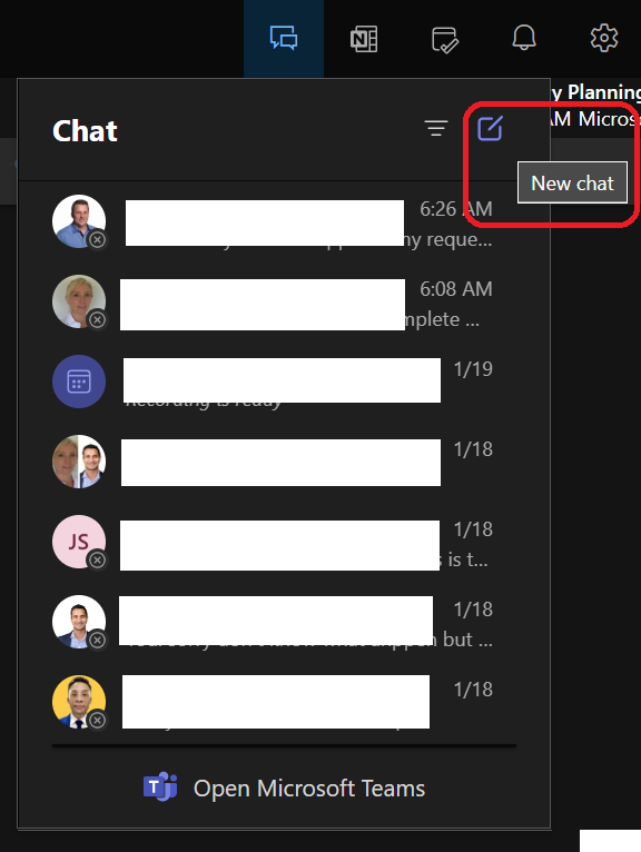 When hitting the chat button, you will see options to either continue the last 7 chats, start a new one or event launch the Teams web client.