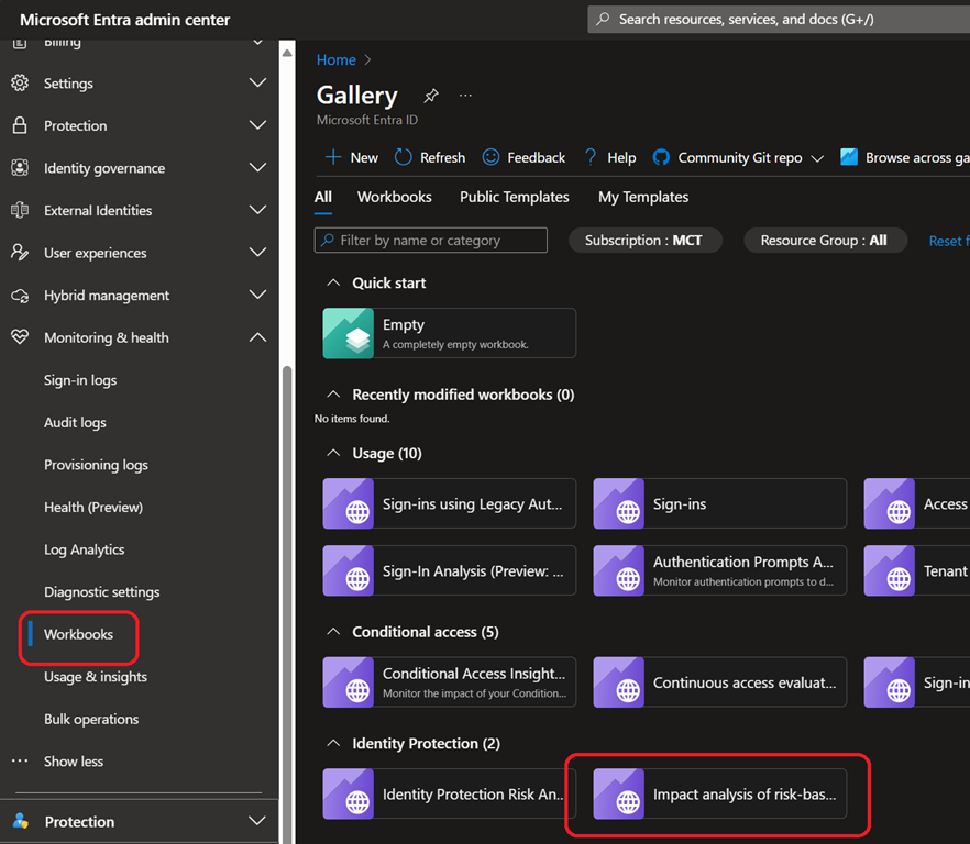 Then you can use the workbook by accessing the Monitoring & health\Workbooks blade to open the Impact analysis of risk-based access policies workbook.