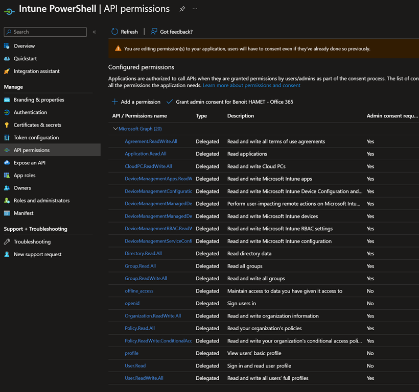 If you use PowerShell to manage your Intune tenant, you are most probably using the Intune PowerShell application (d1ddf0e4-d672-4dae-b554-9d5bdfd93547).