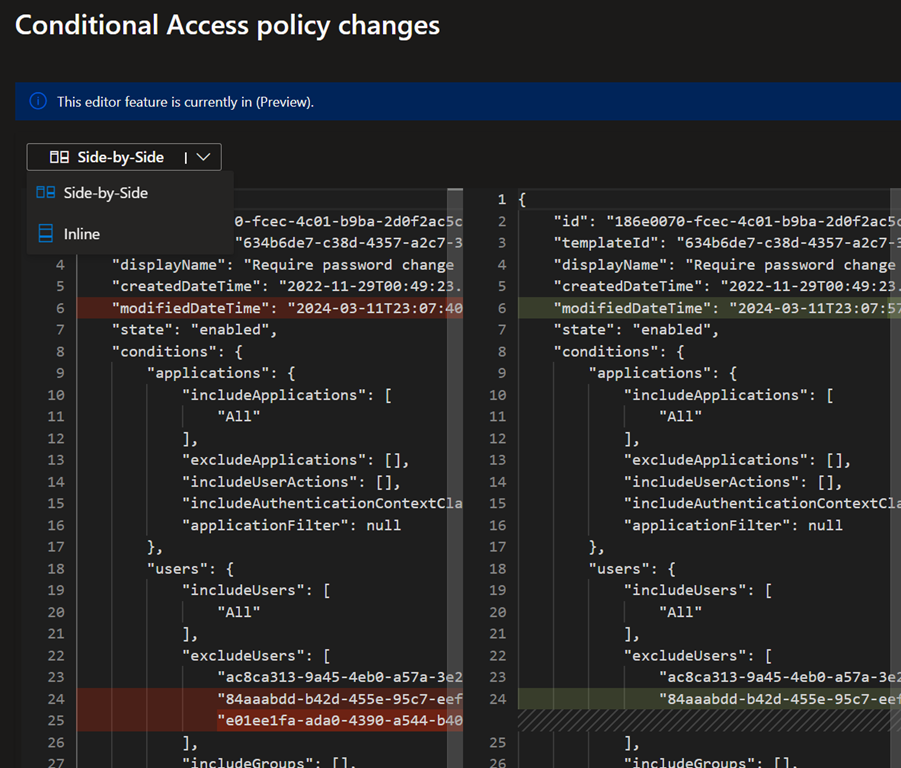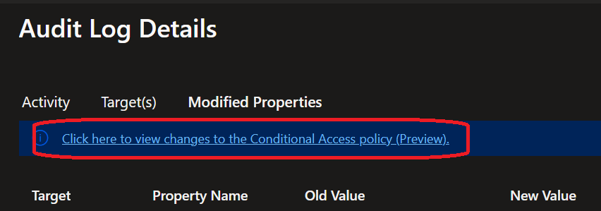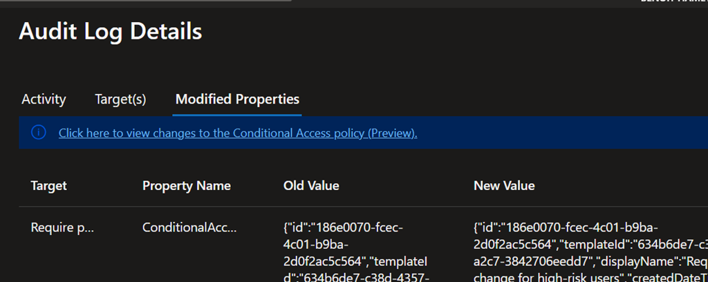 For some of these changes – such as conditional access policy updates – you can also get the old and new value in JSON format.