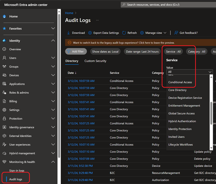 Then filter the logs to Conditional Access service to just get the conditional access configuration activities.