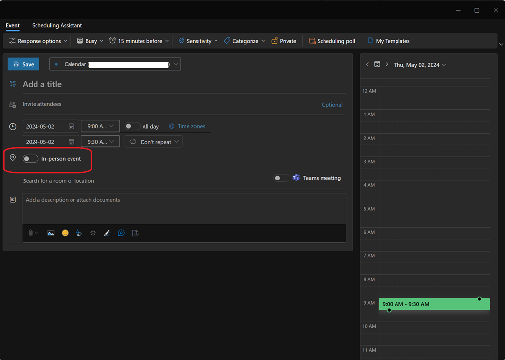 Well, the new Outlook client (not the Win32 one) and Outlook Web Access now offer an option to mark a meeting as ‘in-person event’.