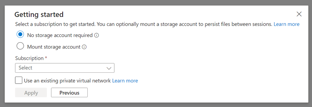 or the direct URL https://portal.azure.com/#cloudshell/) you will be asked to either use “No storage account” or “Mount a storage account”)