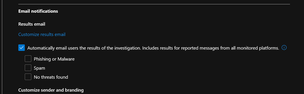 When turning on, you can then choose for which report (phishing, spam or nothing found) will be sent to the end-user reporting emails