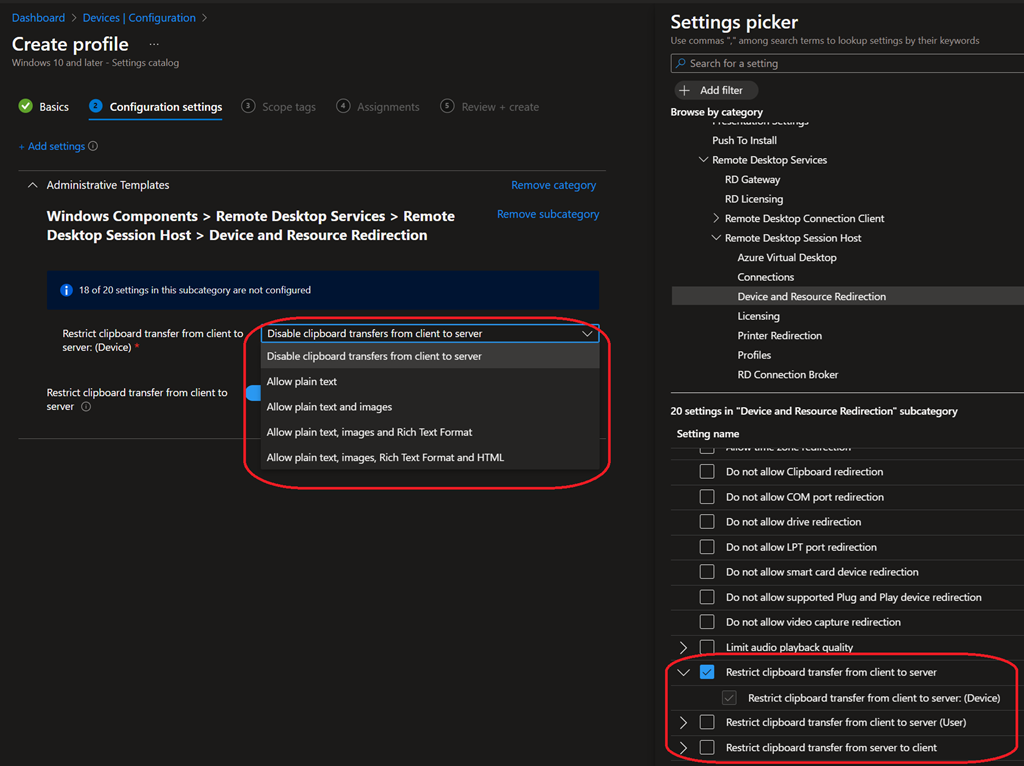 There, use a Settings catalog profile type to configure the clipboard redirection settings available under Administrative templates > Windows Components > Remote Desktop Services > Remote Desktop Session Host > Device and Resource Redirection using one of the available options: