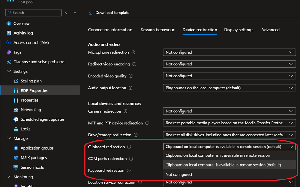 - Host pool RDP properties must allow clipboard redirection, otherwise it will be completely blocked