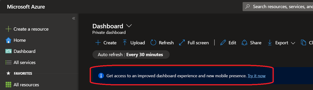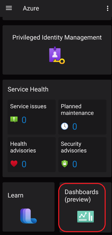 But before you start using dashboard on the mobile app, you need to use the dashboard experience (aka dashboard v2) by connecting to your Azure portal (https://portal.azure.com/) and switch to the new experience