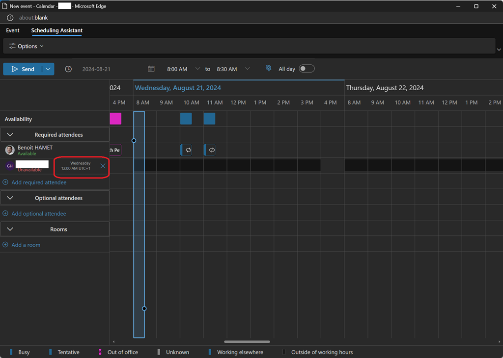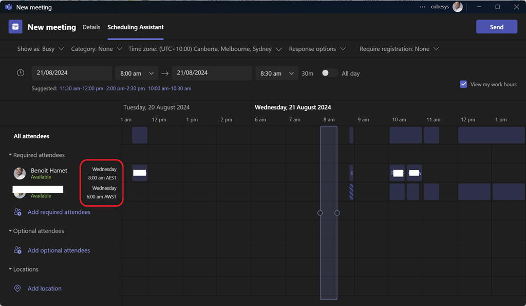 Well, good news as Office 365 – in this specific case new Outlook, Outlook Web Access (aka Outlook on the Web or OWA) and Teams – is now helping you by showing the attendee’s time zone and their corresponding local time when using the scheduling assistant.