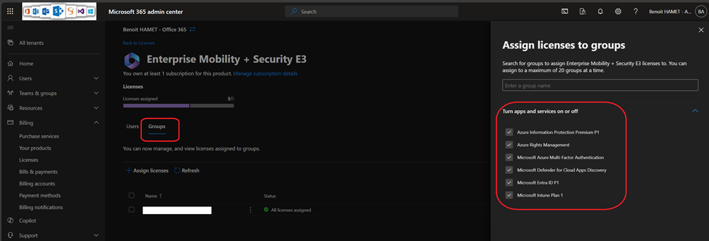 Group based assignment can be managed from the same blade for the corresponding subscription using the Groups tab – you can also still select which services from the subscription you want to get activated