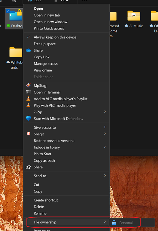 Once the profile has been deployed and applied, end users will see a Lock on top right of these folders and a new option “File Ownership”