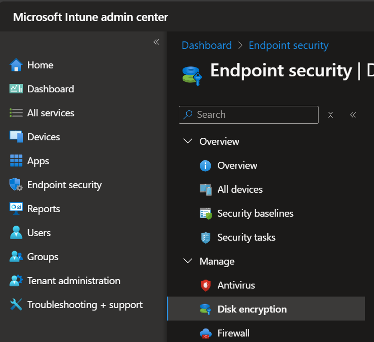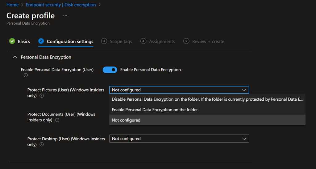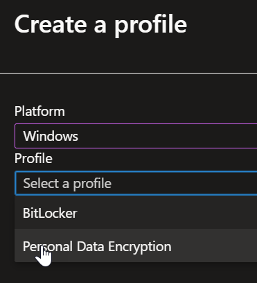Once you are ready, connect to your Intune portal and create a Personal Data Encryption profile from the Endpoint Security\Disk Encryption blade