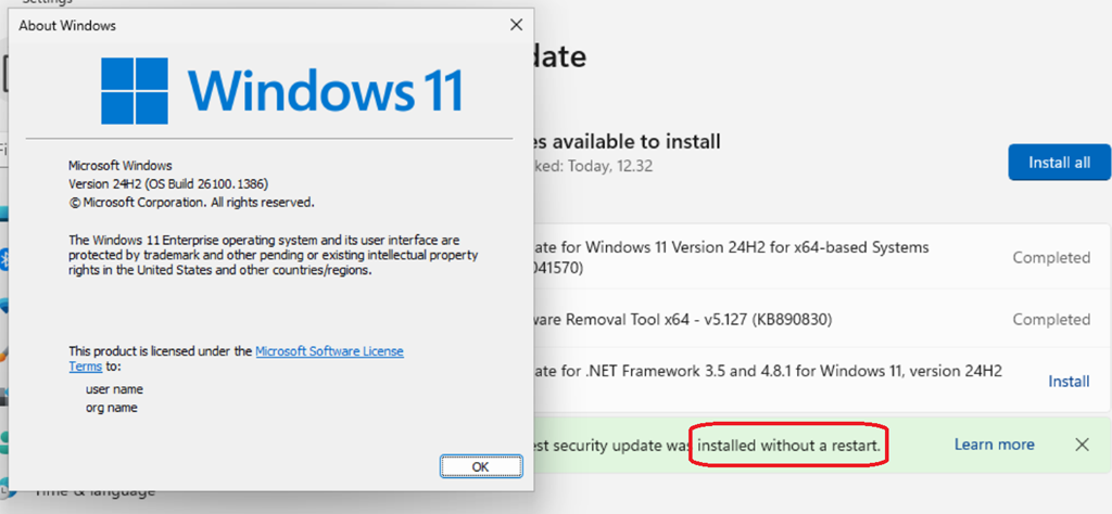 Off course, hotpatching does not apply to feature updates (23H2 to 24H1), drivers updates and (at least at this stage, maybe this will change in the future) non security updates (restart depends on the update).