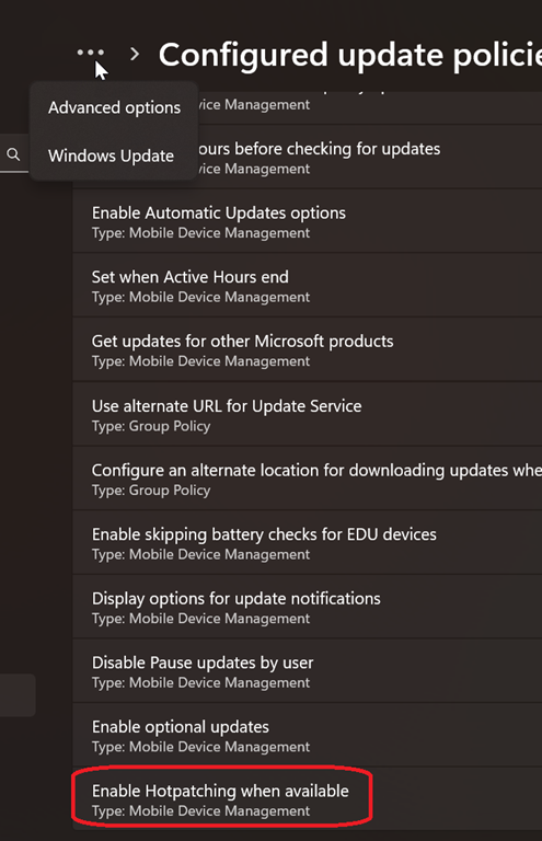 You can confirm the hotpatching policy has been applied by checking Settings\Windows Update\Advanced Options\Configured update policies and look for Enable hotpatching when available