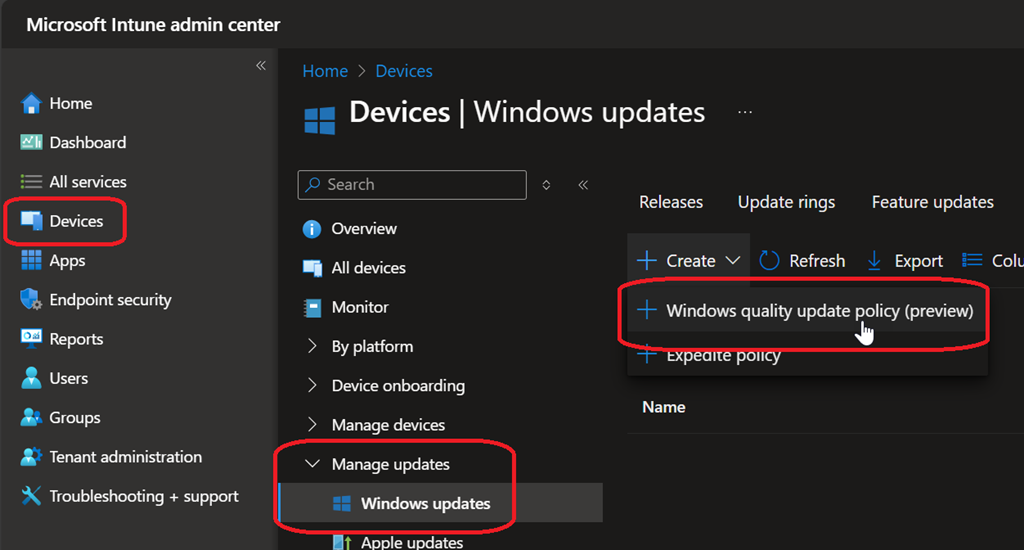 Now, you can create a Quality Updates profile (from the Devices\Manage updates\Windows updates blade from the Intune portal)