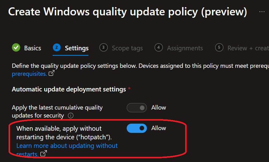 When configuring this update profile, you have to turn on the “When available, apply without restarting the device” option to enable hotpatching on your devices