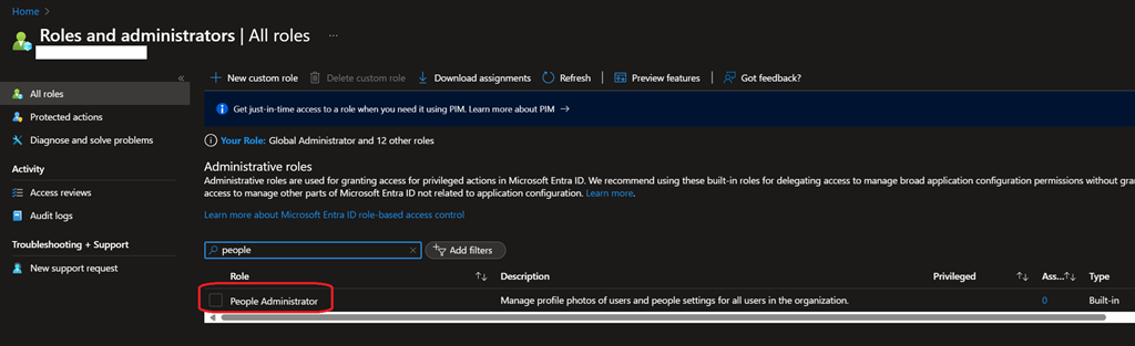 A new Entra ID administration role – People administrator – has been introduced to help managing people-related settings and profile photos without needing the high privileges of Global admin or User admin roles.