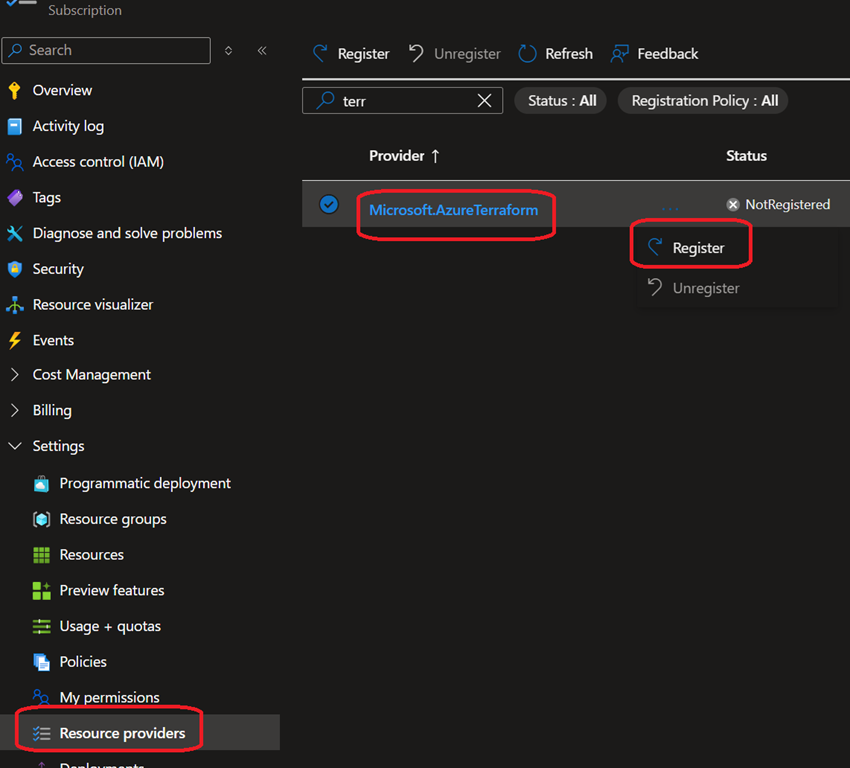 - Azure portal: from the Resource providers blade of the subscription, search for Microsoft.AzureTerraform
