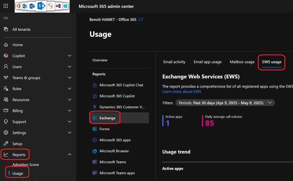 To resolve this lack of visibility, Microsoft has introduced an EWS usage report in Office 365 administration portal (Home – Microsoft 365 admin center).