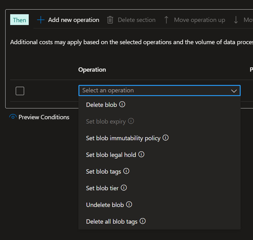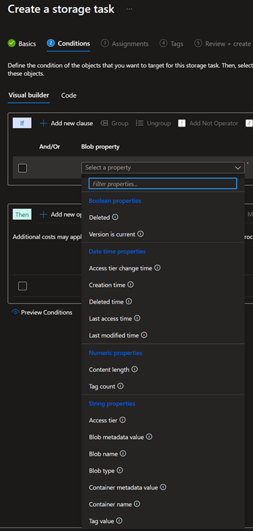When creating the task you can choose against various storage account properties – from version, created/modified date, tags or storage tier (complete list available here Storage task conditions – Azure Storage Actions | Microsoft Learn)