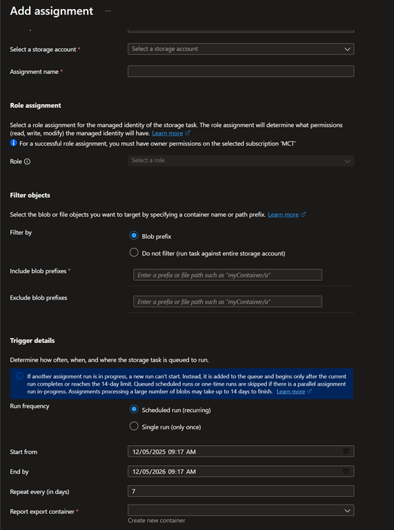 Once completed, you need to assign the task to a storage account and define the schedule to run the task