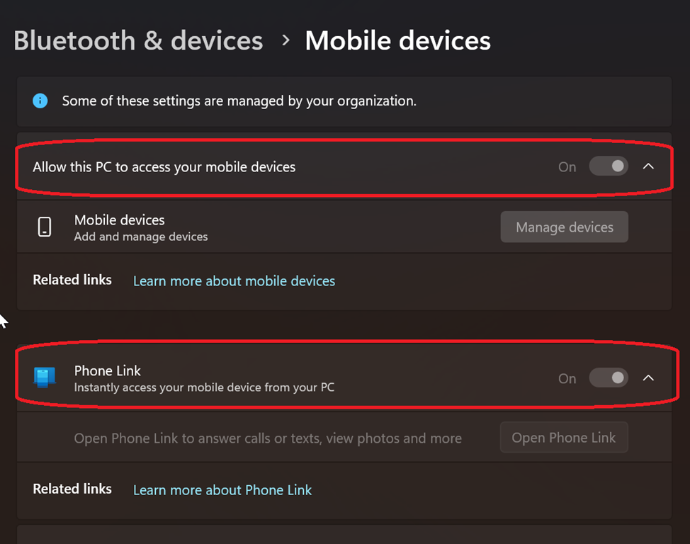 As my device is managed by Intune, I first looked at Intune configuration profiles for settings which could be related – such as Allow Phone PC linking, Allow connected devices… and all were good to allow Phone Link.