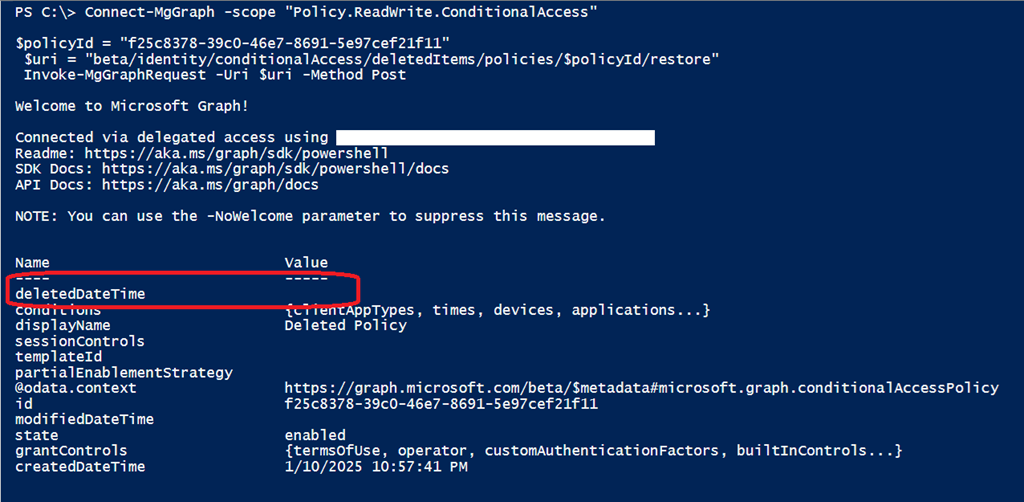Once successful recovered, the deletedDateTime attribute value is empty and the policy is showing back in the Entra ID Conditional Access policies blade.