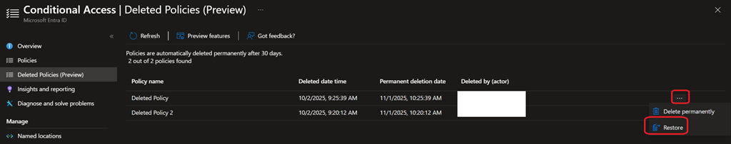 - From the Conditional Access\Deleted policies blade, open the contextual menu and select Restore