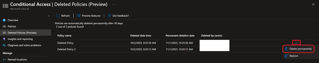 - From the Conditional Access\Deleted policies blade, open the contextual menu and select Delete permanently