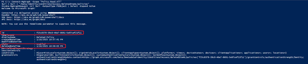The ID attribute will be the important one to grab for recovering the deleted conditional access policy