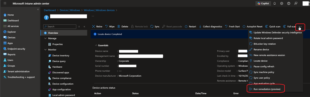 From the device Overview blade, open the More menu option (the ellipsis) to select Run remediation