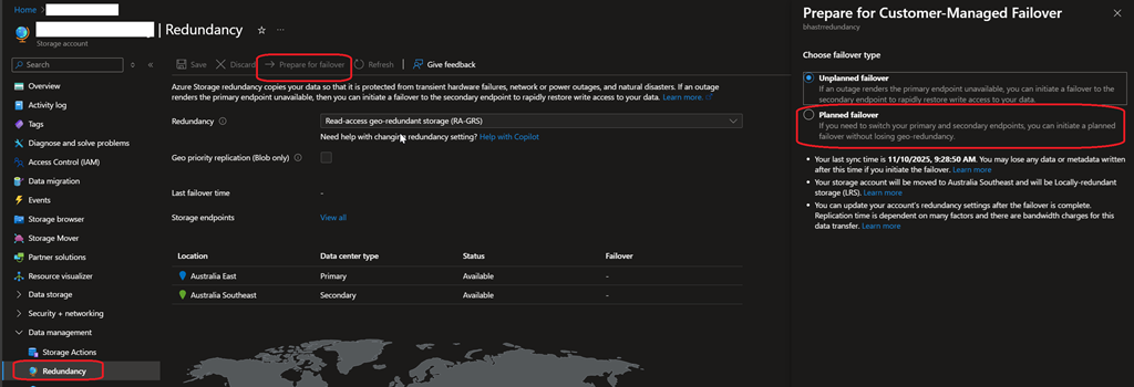 To start a planned failover, access your storage account and trigger the Failover to select Planned failover from the Redundancy blade.