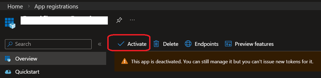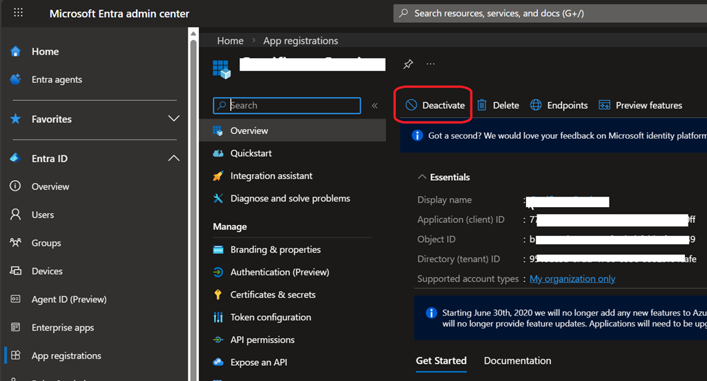 Connect to your Entra ID portal (Microsoft Entra – Microsoft Entra admin center) and access the App Registration blade (direct link App registrations – Microsoft Entra admin center) and select the application you want to deactivate