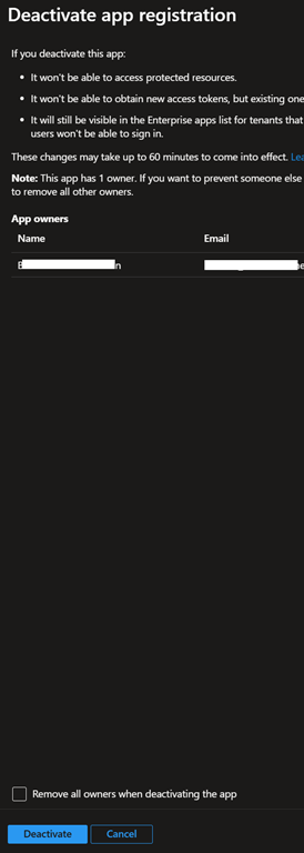 When deactivating the app, you will be asked to remove app owners to avoid them to reactivate the application