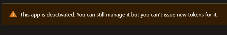 Once the application is deactivated, a banner is being shown to notify any administrators that the application is no longer available for sign-in but can still be managed