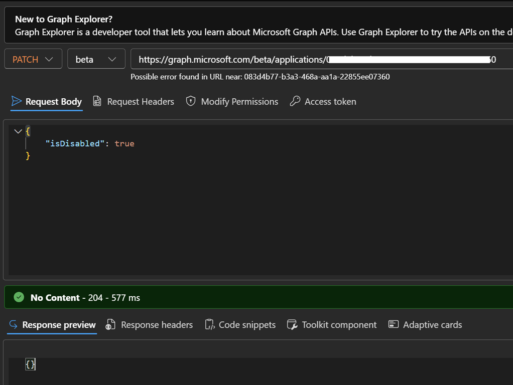 Once you have the object ID of the application you want to deactivate, run the below in Graph API