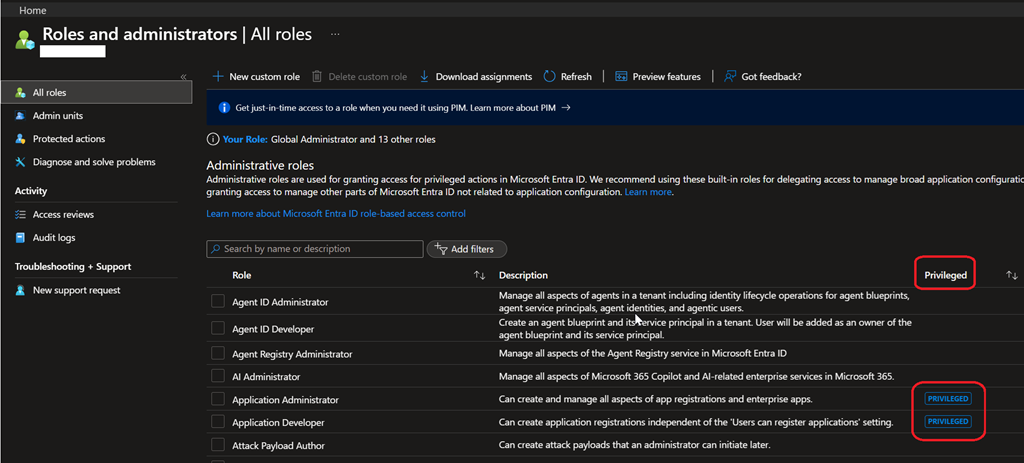 Privileged roles can be easily identified in Entra ID portal from the Roles and admins blade as they are marked with the tag Privileged (or you can read this article Microsoft Entra built-in roles | Azure Docs)